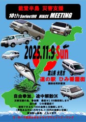 ー能登半島地震復興支援ー 【第10回 100系ハイエースチャリティーミーティング IN 氷見】 日時:令和7年11月9日(日) 9:00~16:00 場所:ひみ番屋街向かい(山側) \全国から100系ハイエースが大集合/