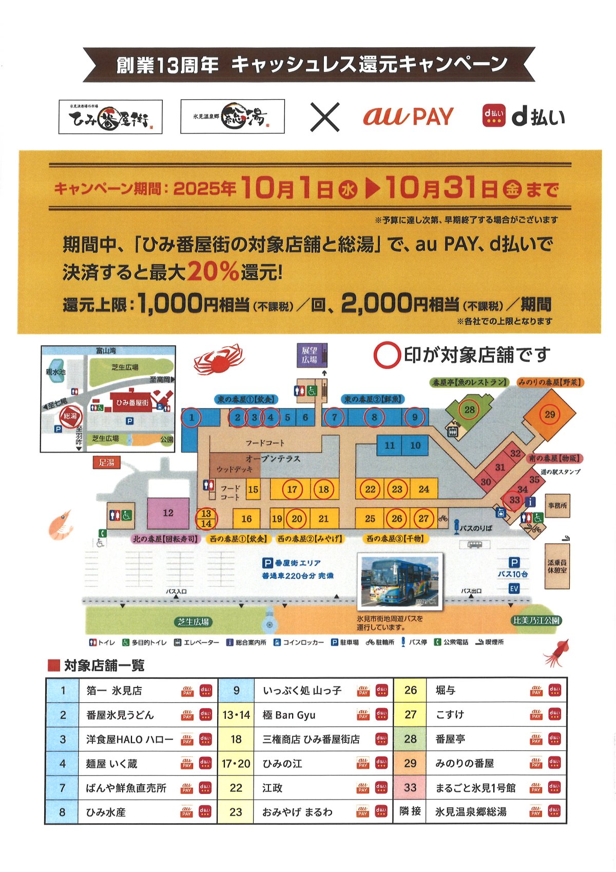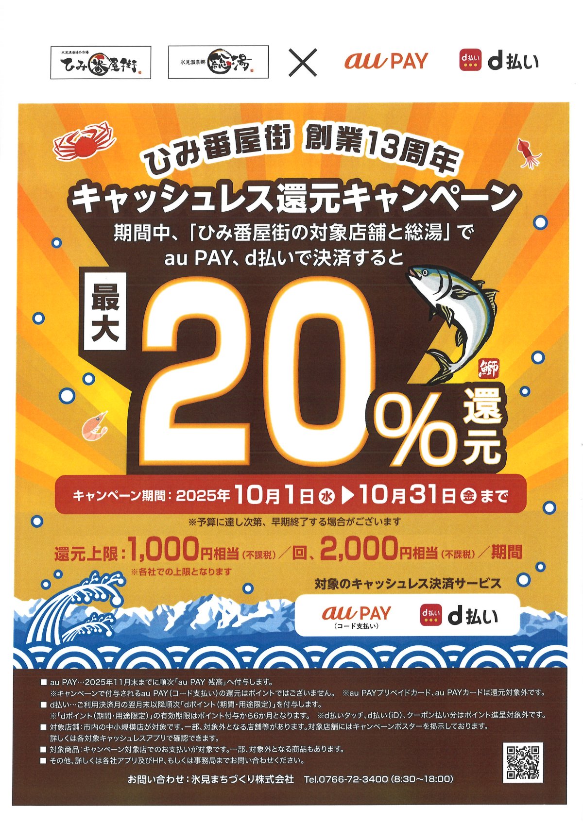 ひみ番屋街キャッシュレスキャンペーン💰 2025/09/04 UP 【ひみ番屋街キャッシュレスキャンペーン】 日時:2025年10月1日(水)~31日(金) ※上限に達し次第終了 場所:ひみ番屋街対象店舗、総湯(QRコード) 内容:対象店舗で“d払い”または“auPAY”でお支払いいただくと、20%還元!!(お一人様1店舗上限1,000ポイント、お一人様上限2,000ポイント)