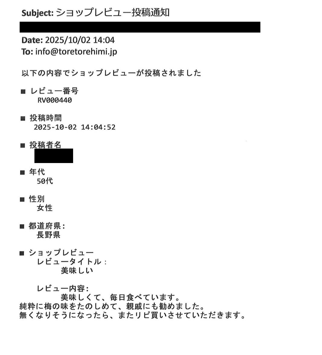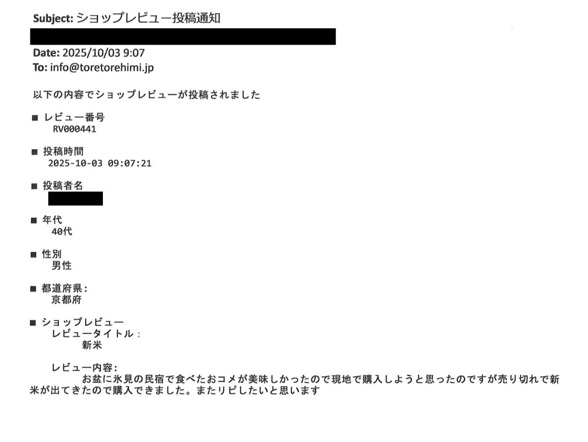 ショップレビューが届きました。