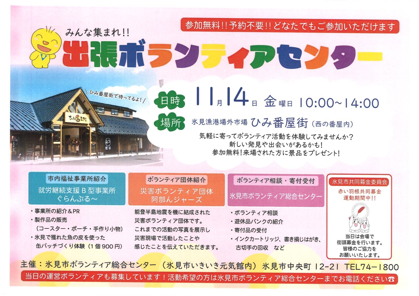 【緊急速報🎙】出張ボランティアセンター 2025/11/13 UP 【緊急速報】 みんな集まれ!!<出張ボランティアセンター> 日時:令和7年11月14日(金) 10:00~14:00 場所:【西の番屋】多目的ホール お気軽によってボランティア活動を体験してみませんか! ご来場された方に景品をプレゼント