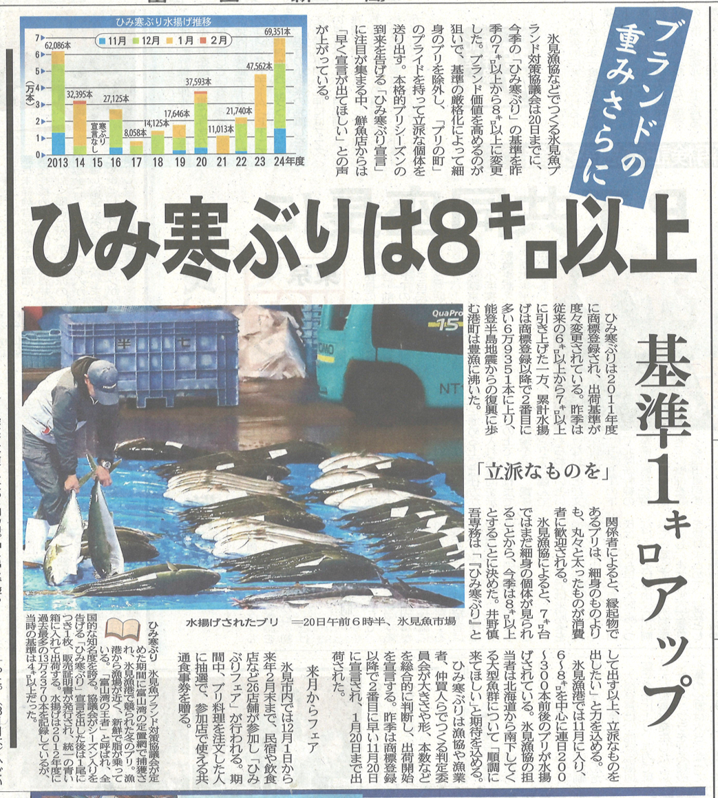 今季の「ひみ寒ぶり」の基準を昨季の7㌔以上から8㌔以上に変更!
