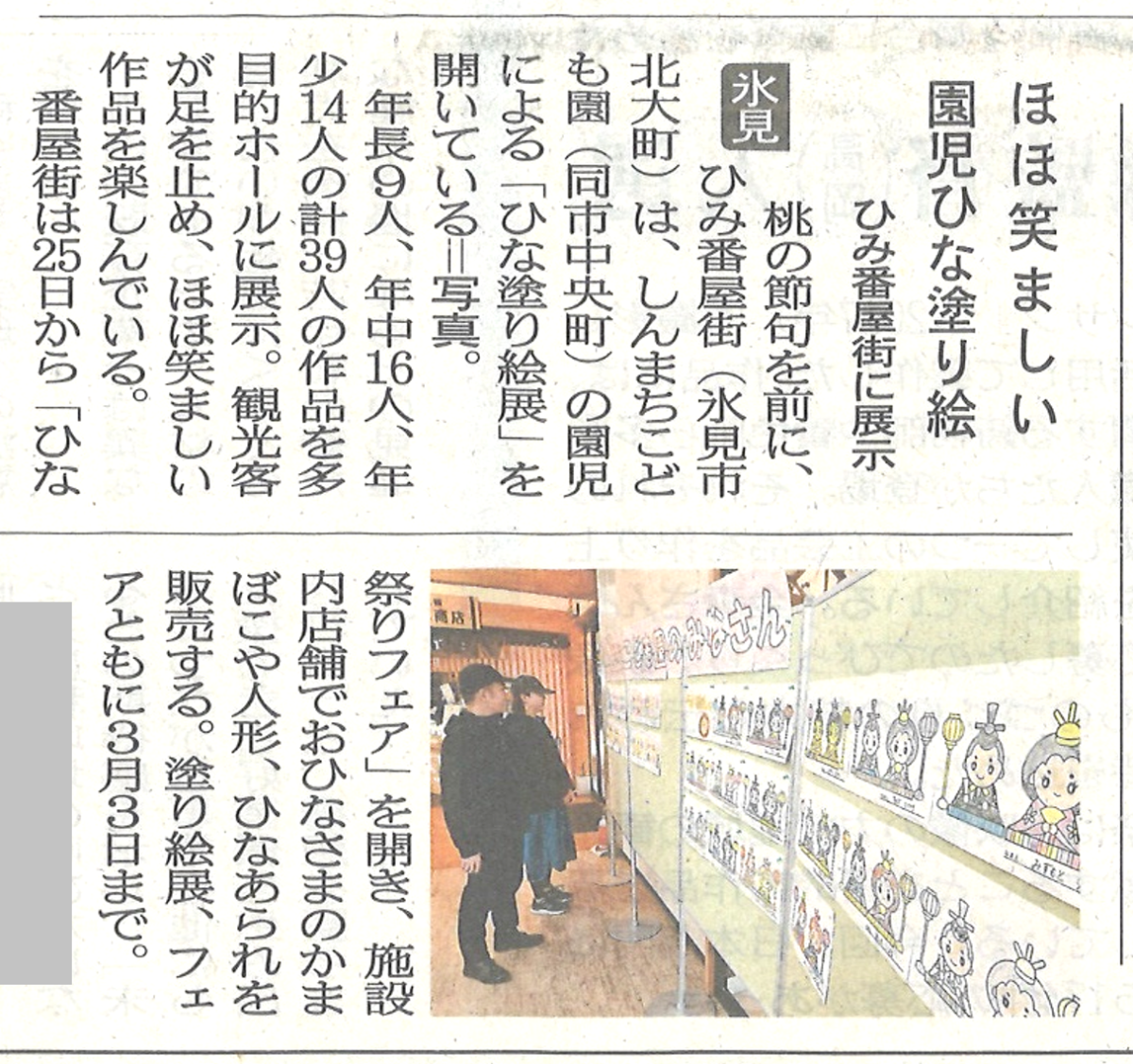 ひな祭りフェア🎎 2026/02/25 UP <ひな祭りフェア> 2/25(水)~3/3(火) 「あかりをつけましょ ぼんぼりに…♪」 各店舗では、桃の節句を祝う、季節限定の❝ひなまつり商品❞が盛りだくさん! また、【西の番屋】多目的ホールでは、〖氷見市しんまちこども園 ひなぬりえ展〗、年長(ぞう組)9名・年中(らいおん組🦁)16名・年少(ぱんだ組)14名、計39名の園児の皆さんの力作を発表✨ 本日の朝刊にもご掲載いただきました。 ぜひ、たくさんのお客様のご来店、お待ち申し上げます。