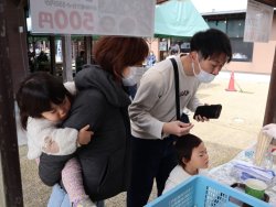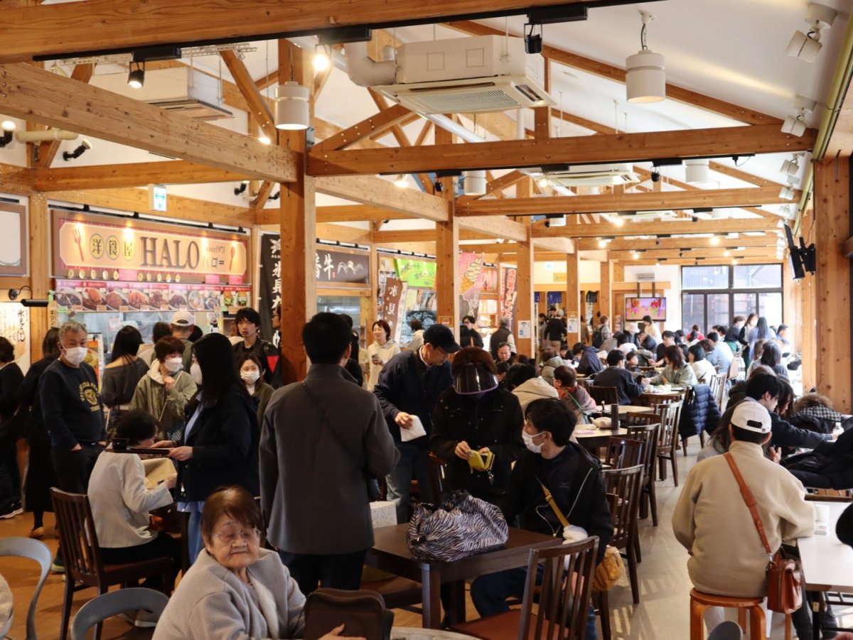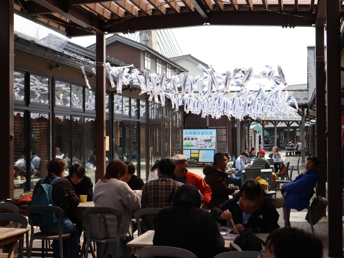 オープンテラスの空では、300匹のイワシのぼりが泳ぎ、正面では、氷見イワシの「イ」の字の格好をして記念撮影ができる横断幕‥など