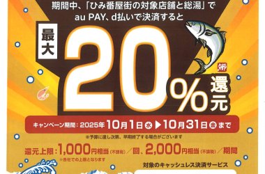【ひみ番屋街キャッシュレスキャンペーン】 日時:2025年10月1日(水)~31日(金) ※上限に達し次第終了 場所:ひみ番屋街対象店舗、総湯(QRコード) 内容:対象店舗で“d払い”または“auPAY”でお支払いいただ […]